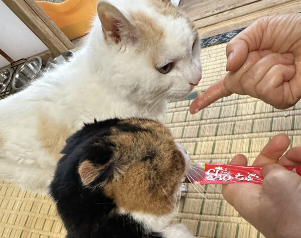 元外猫のシロ君と初めて出会った時は、極度の人間恐怖症で中々姿を見せてくれませんでした。目の前でごはんを食べてくれるまで1年、近くに寄って来てくれるまでに2年、触れるようになるまでに3年。抱っこできるまでに4年かかりました。そんなシロ君との距離を縮めてくれたのが、CIAOちゅ~るでした。シロ君はちゅ~るが大好き。お家の子になった今も特別な日のおやつはちゅ~る。待ちきれなくて背伸びをして催促する姿が愛しくて、ついついあげてしまいます。