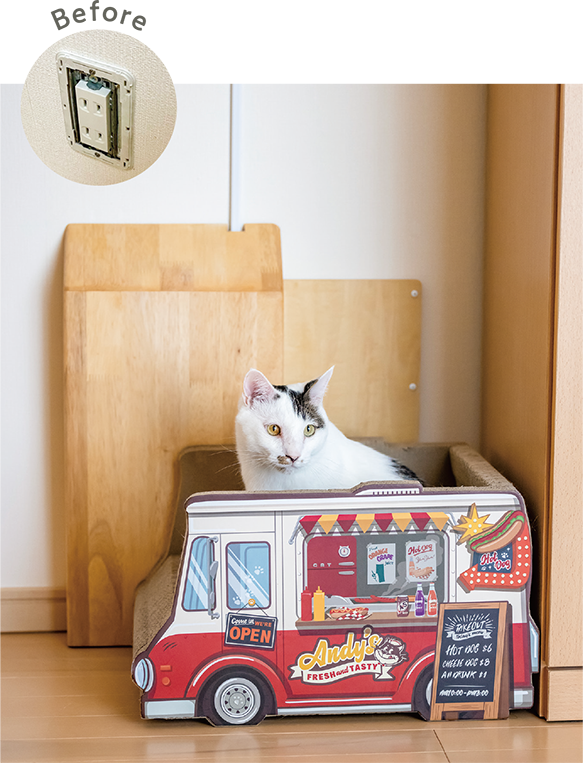 コンセントの枠も爪で剥がされた。コードを噛みちぎると感電の危険があるため、丸ごと木箱で覆うことに。前に置かれたバス型の爪とぎは囮で、木箱に意識が向かないようにしている