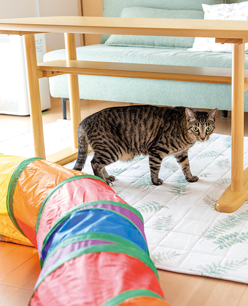 ぐるりと取りつけたキャットステップと合わせて、2匹の注意をコンセントなどからそらす役割を果たしている。トンネルは障害物競走で大活躍