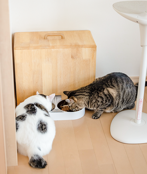 ごはんがあると気づいてしまい、自動給餌器のコードを引き抜いて倒してしまった。こちらもコンセントと同じく、木箱で覆っている。壁に固定した背板にはガイドレールが仕込んであり、ごはんを補充するときは取手を持ち上げながら引き抜いて開ける