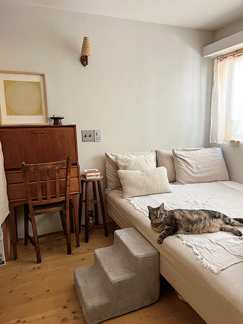 薪ストーブが印象的なTomo.さんのお家はケミカルな素材をできるだけ排除した、人はもちろん猫にとっても気持ちのよい空間。シニアになった猫たちが負担なく穏やかに過ごせるような配慮も、暮らしのあちこちから見えてきます。