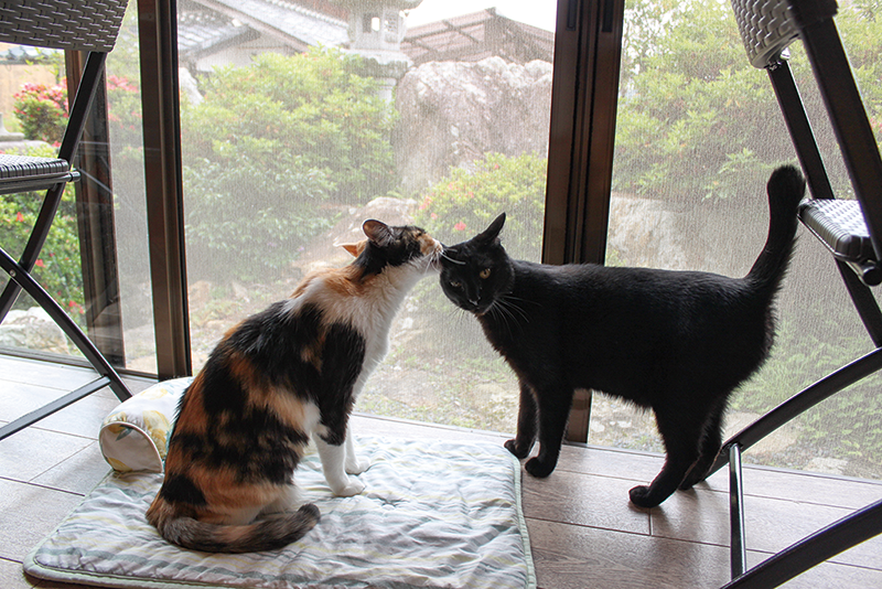 縁側で猫が鼻キス。安心できる場所に保護されてよかったね!