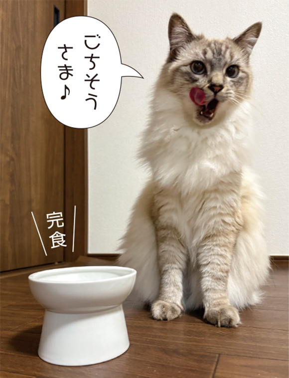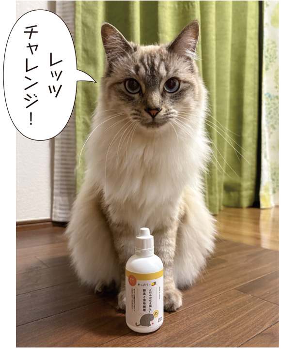 編集櫻田の愛猫・穂(すい)は、ふさふさの豊かな毛並みゆえに、毛玉を吐いてしまうこともしばしば。「ねこおもい ごはんの吐き戻しに 酵素と食物繊維」で吐き戻しの軽減を目指します。