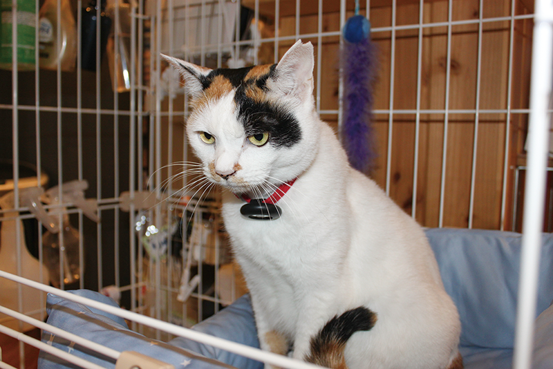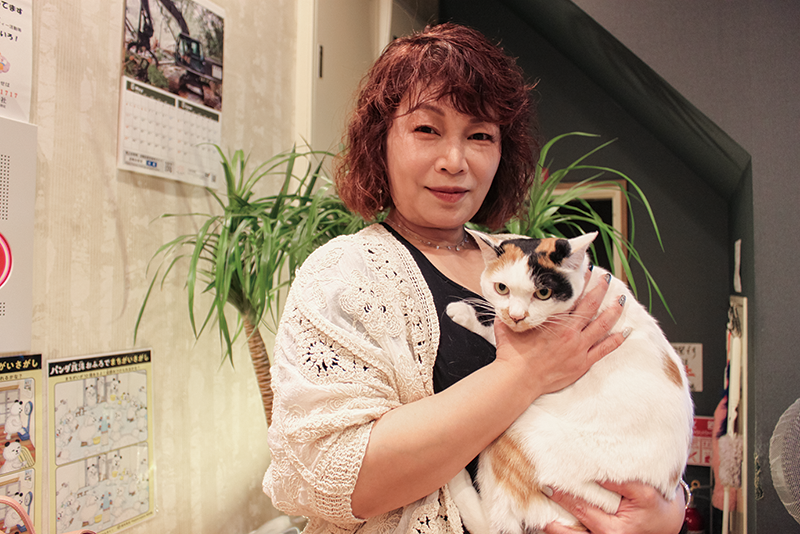 「今日もみなさん、ごきげんさんで過ごせましたか?」。一日の疲れを癒やしに銭湯ののれんをくぐると、女将の米谷智也子さんがやわらかい笑顔で迎えてくれる滋賀県の大津湯。番台の隣にケージがあって、キレイな三毛猫がひかえている。大津湯の番台猫〝福ちゃん〟(4歳♀)だ。