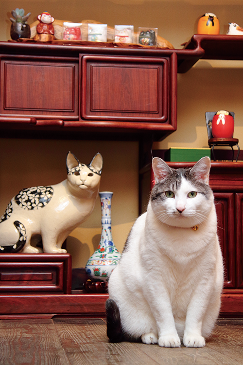 知らなければ通り過ぎてしまうような、でも看板猫の「福くん」(9歳♂)に一度招かれたら、忘れられないお店!店先でどっしり構える7キロの体。思わず置物と見間違えてしまう「招き猫」です。恰幅が良く、まるで大きな豆大福のよう……。ただ座っているだけで、その場に福が満ちていく不思議。圧倒的な存在感に、すっかり心奪われてしまいます。