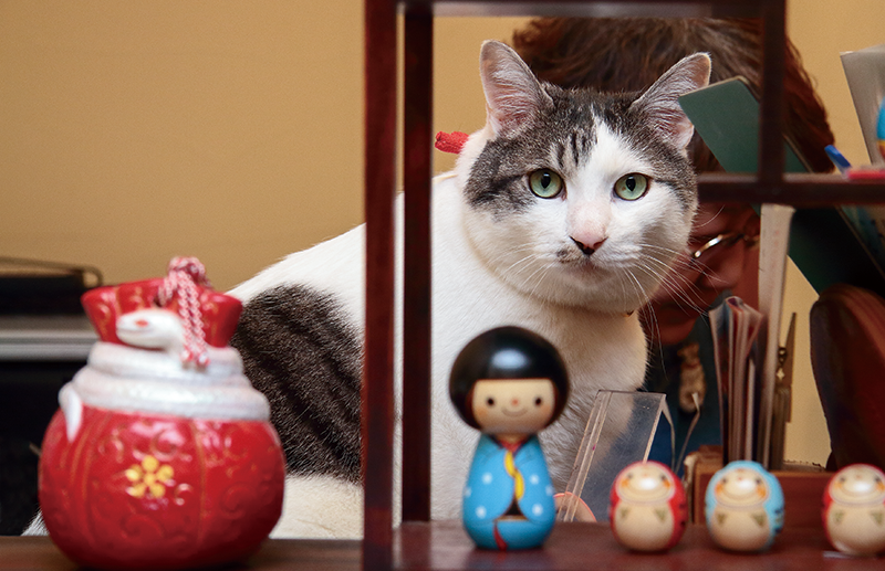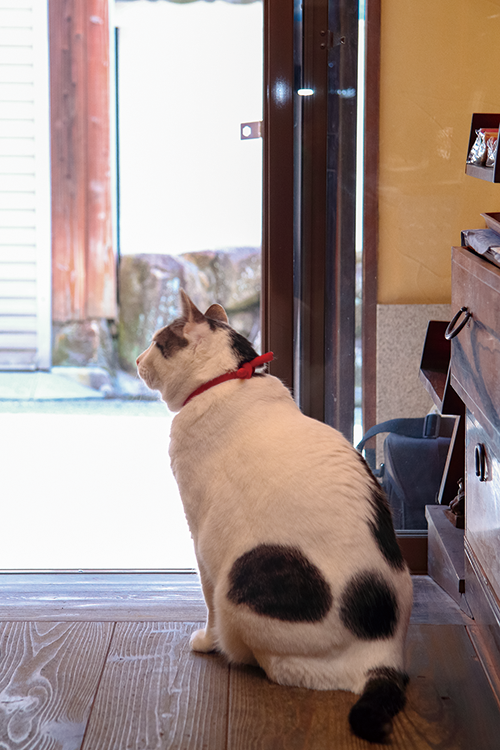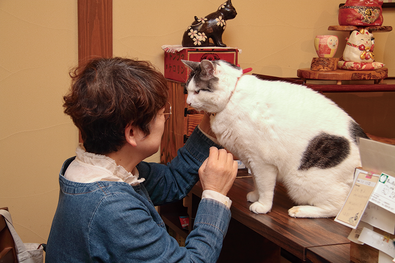 そんな福くん、自宅からの通勤距離は約1メートルですが、出勤は気まぐれです。しかし、一旦お店に出れば、しっかり任務を果たします。訪れるお客さんに「さあ、存分に撫でれば良いぞ」とでも言っているかのような、懐の深い癒しのサービスを提供。お客さんの心をしっかり掴んでいるようです。