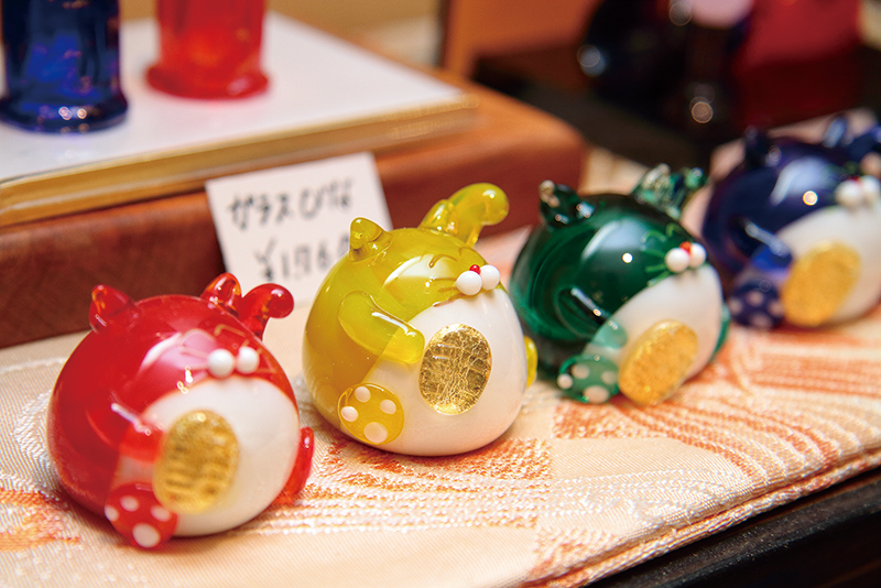 カラフルな招き猫の ガラスびな。福くんのご加護で霊験あらたか!?