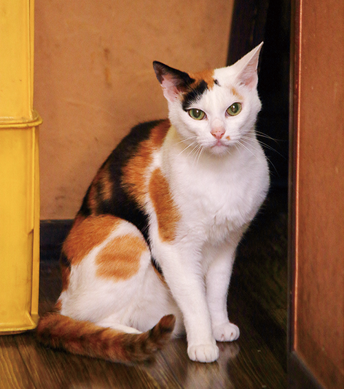 きりりとした切長の目に、美しく散った三毛柄。おせんちゃんにはめったに会えないが、この気高さ は一度見たら忘れられない