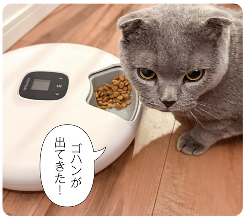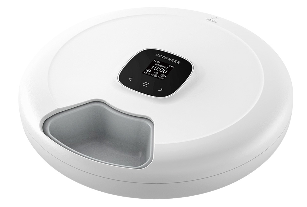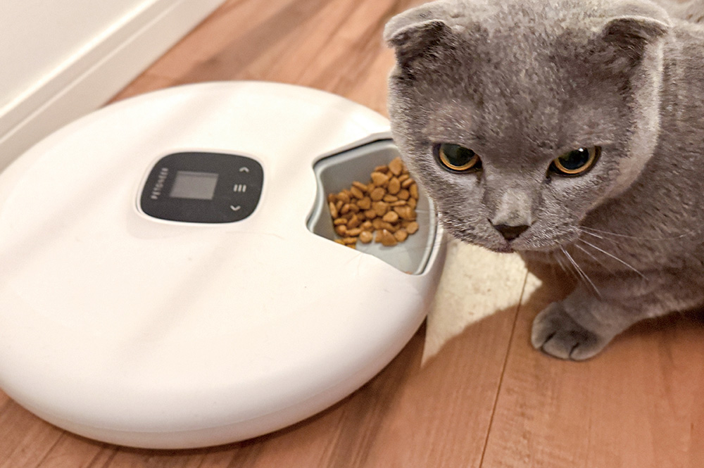 そこで導入したのが、スマホ対応回転式自動給餌器「ペットニア ニュートリ・スピン」。1日最大5回までスマホから給餌スケジュールを設定でき、時間になるとトレイが回転してフードが出てくる仕組みです。