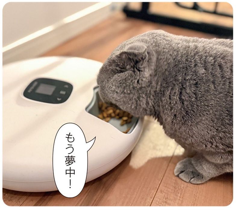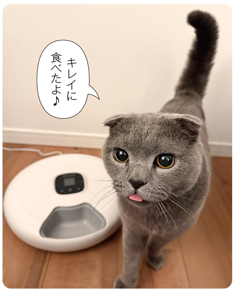 「ペット家電を使うのが初めての私でも、簡単に設定や操作ができました。フードが上からザーっと落ちてくるタイプではないので、少しビビりな一面のあるダリも音に警戒したりせず、その点も安心です。猫初心者だからこそ、留守中にお腹を空かせていないか仕事中も気がかりでしたが、心置きなく出かけられるようになりました」